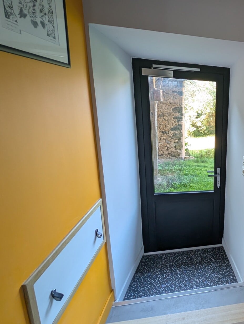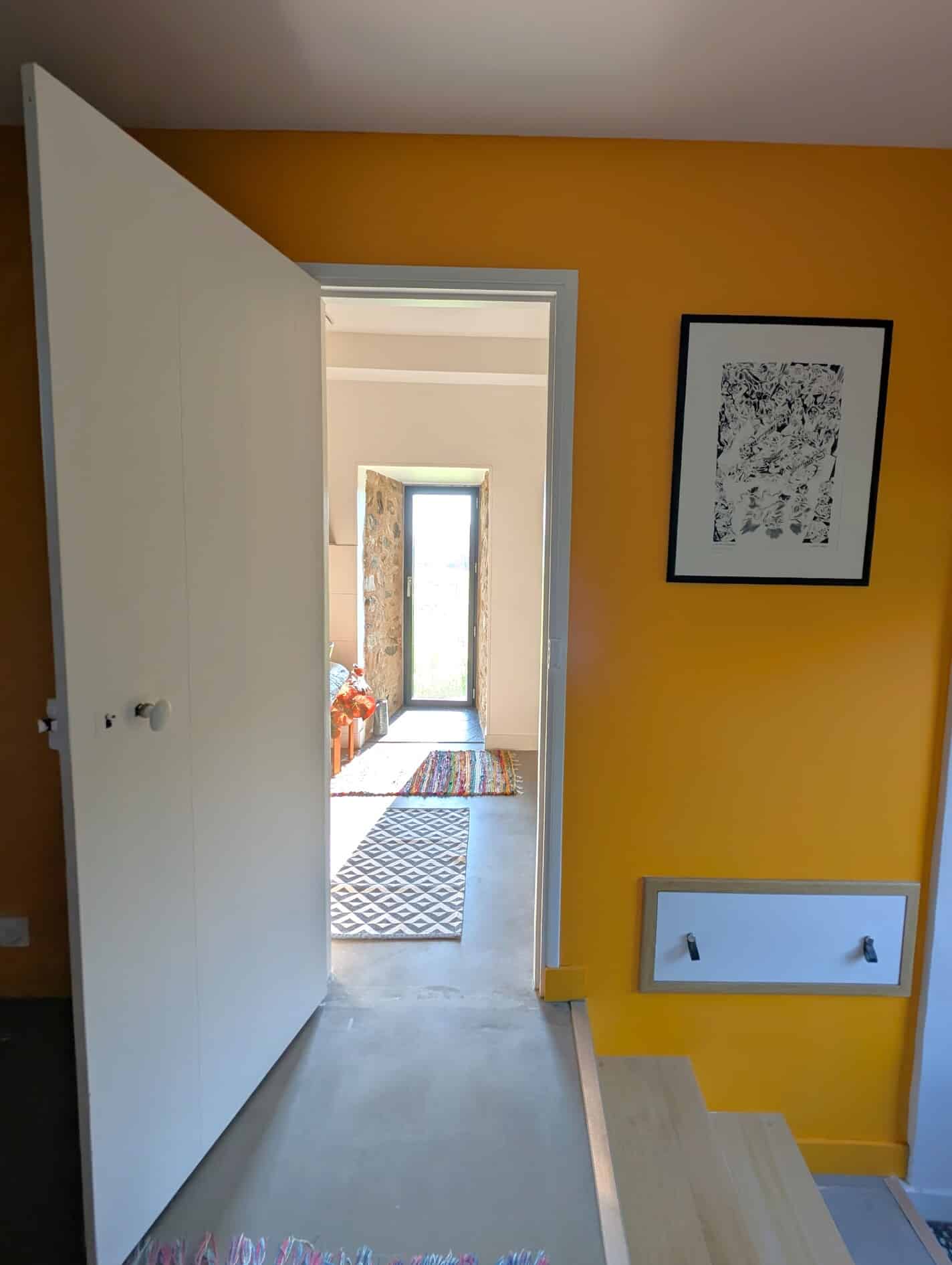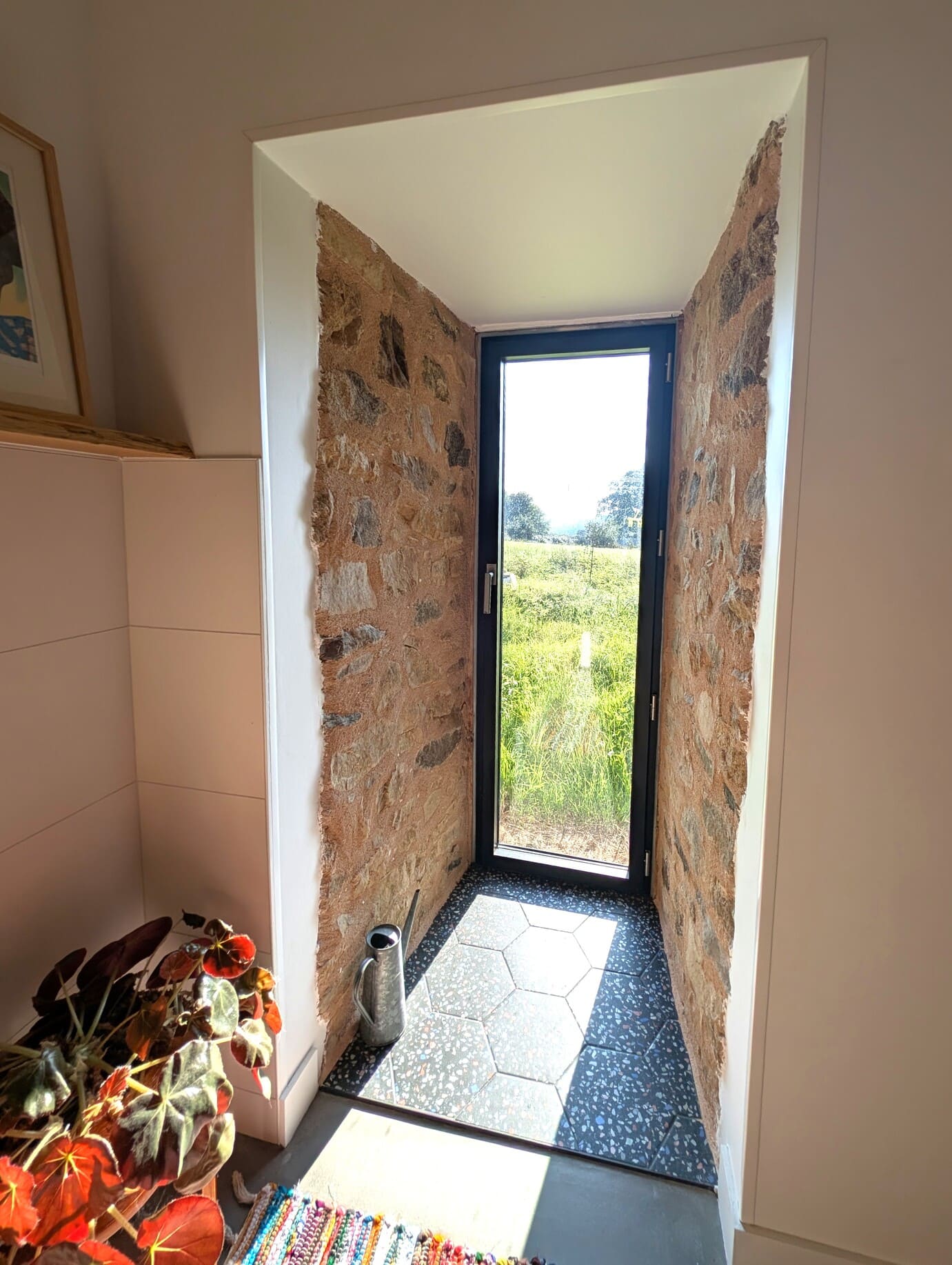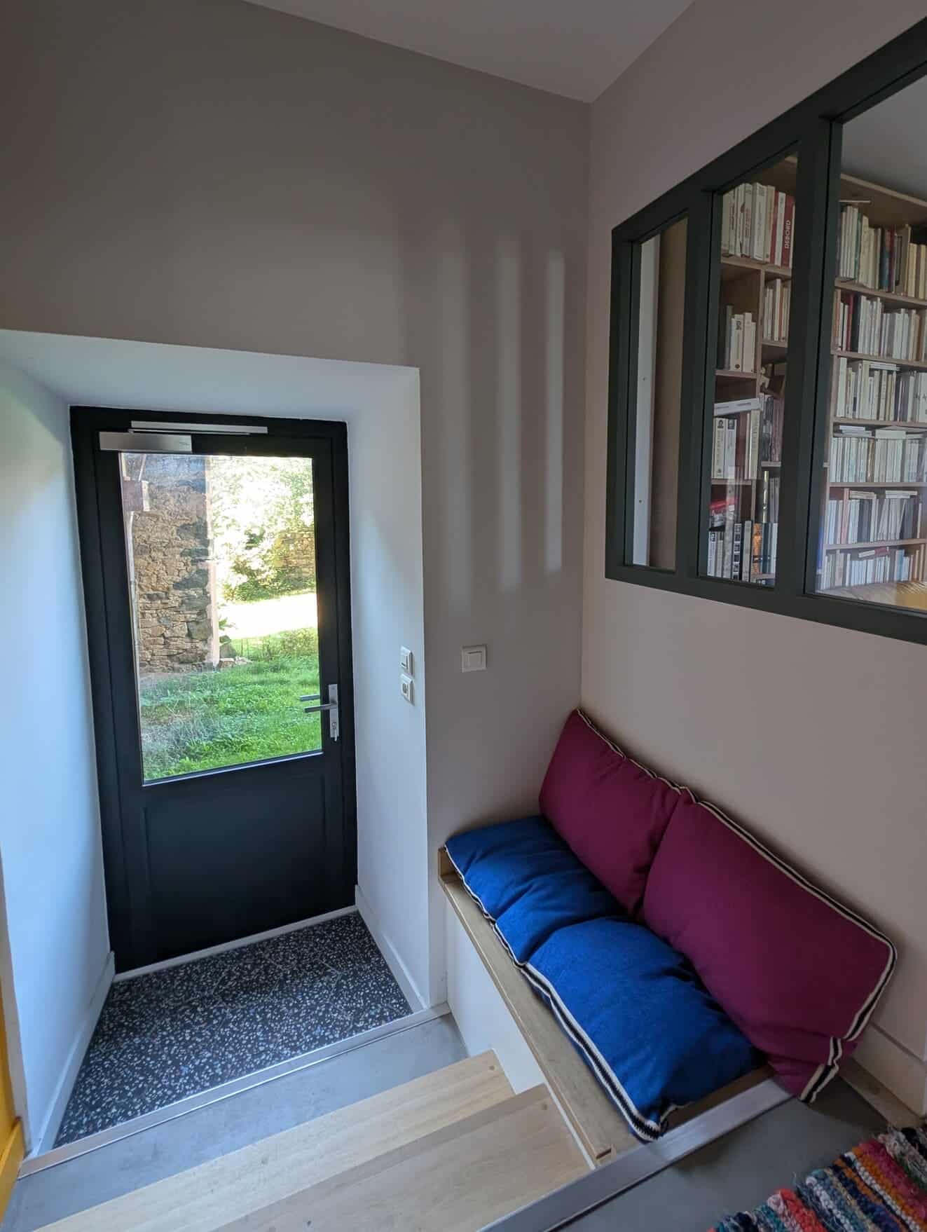Afin d’optimiser la luminosité, la petite fenêtre carrée, initialement très basse, est agrandie pour devenir une porte vitrée, apportant ainsi plus de lumière. Et surtout pour apporter une vue sur un extérieur sans vis à vis.