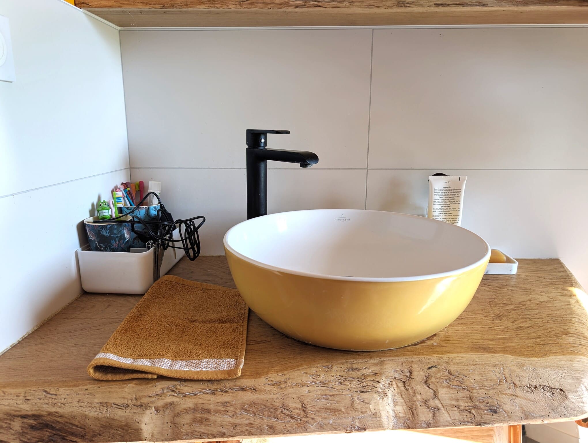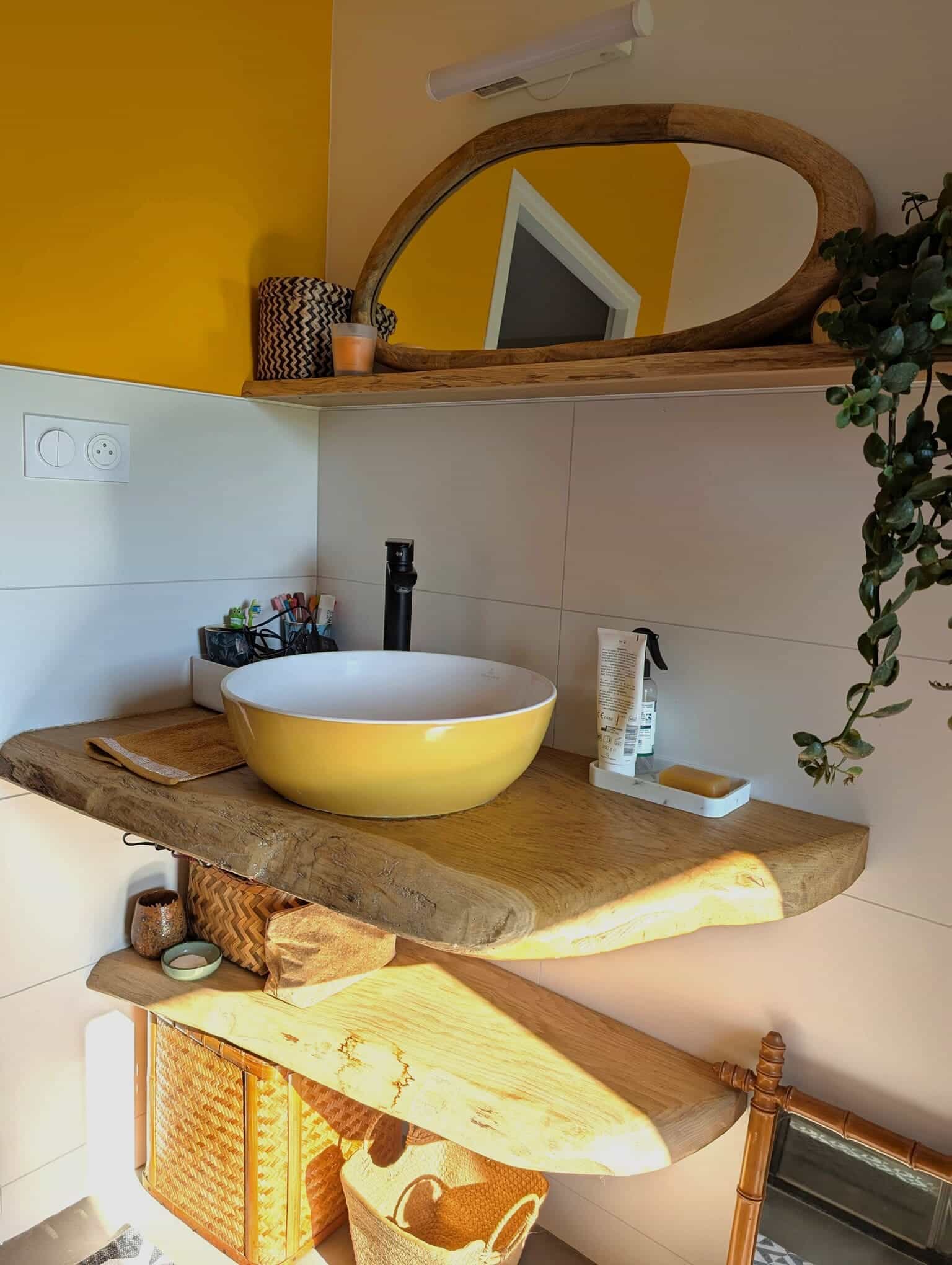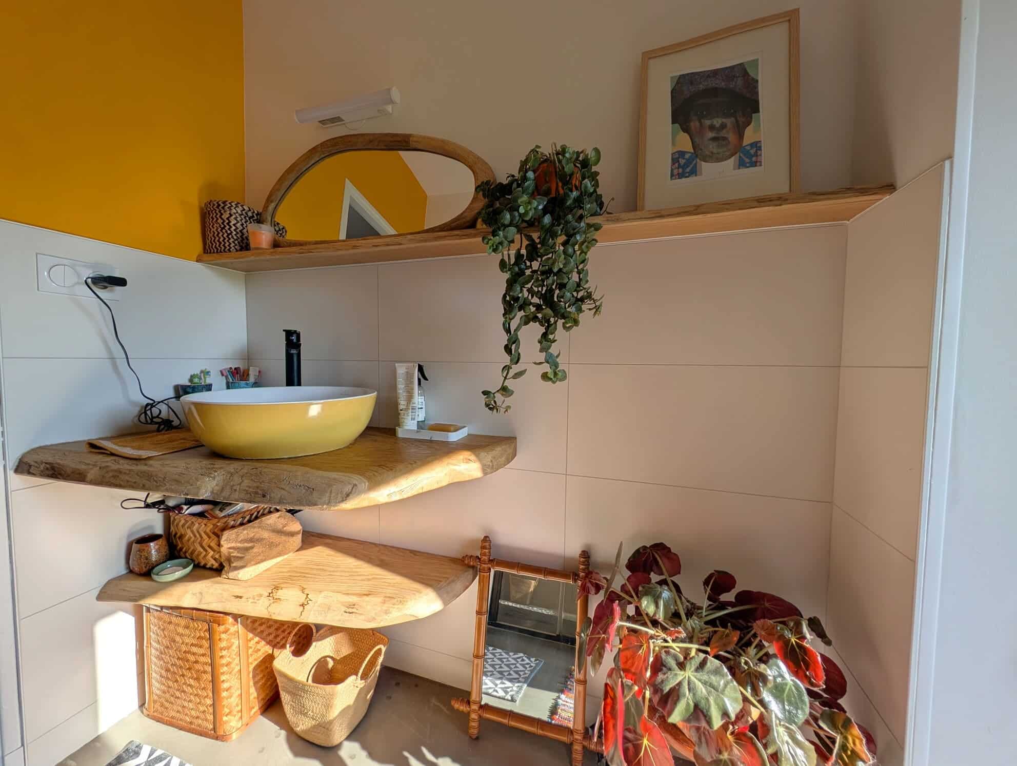 – Salle d’eau : Simplicité et efficacité définissent cet espace pour recevoir des amis. Une vasque jaune repose sur une planche de bois, complétée par une étagère assortie pour un rendu naturel et chaleureux. Une banquette intégrée équipe la douche pour plus de confort et de praticité.
