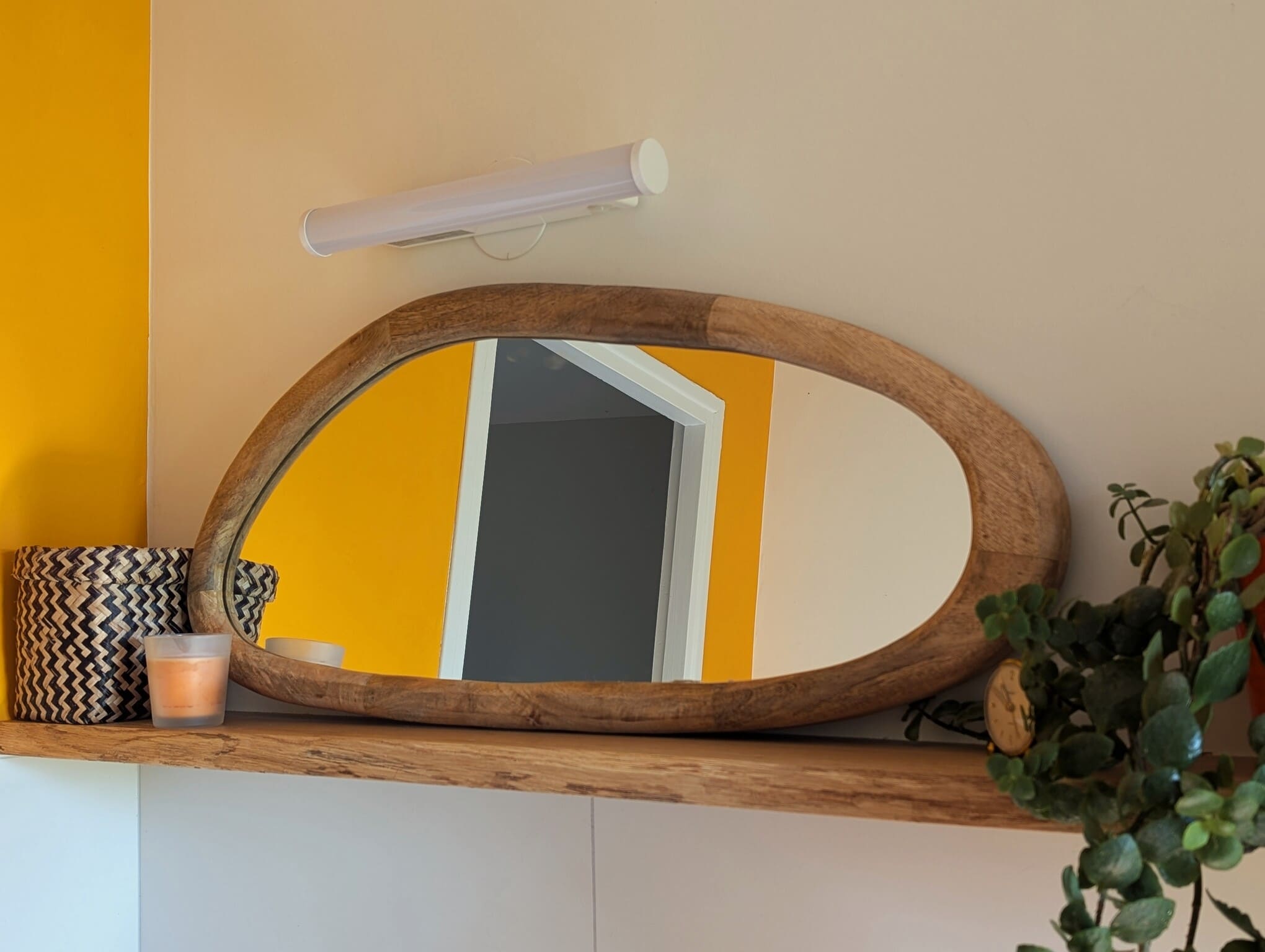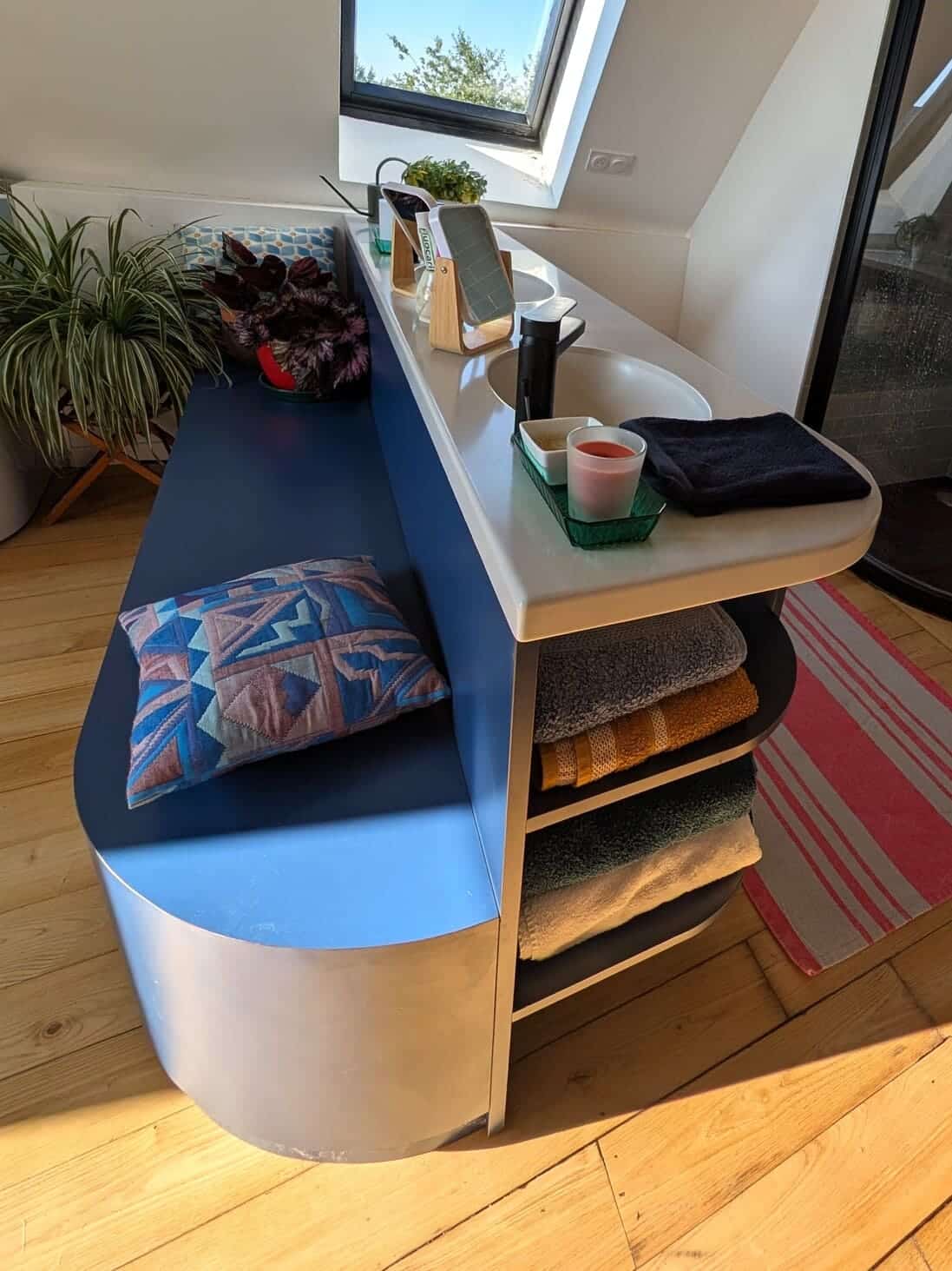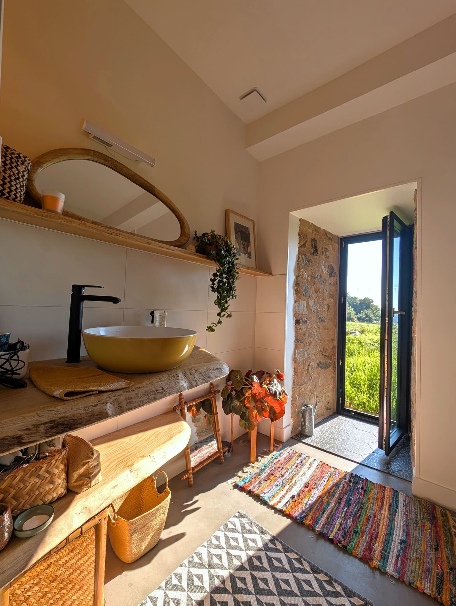 – Salle d’eau : Simplicité et efficacité définissent cet espace pour recevoir des amis. Une vasque jaune repose sur une planche de bois, complétée par une étagère assortie pour un rendu naturel et chaleureux. Une banquette intégrée équipe la douche pour plus de confort et de praticité.