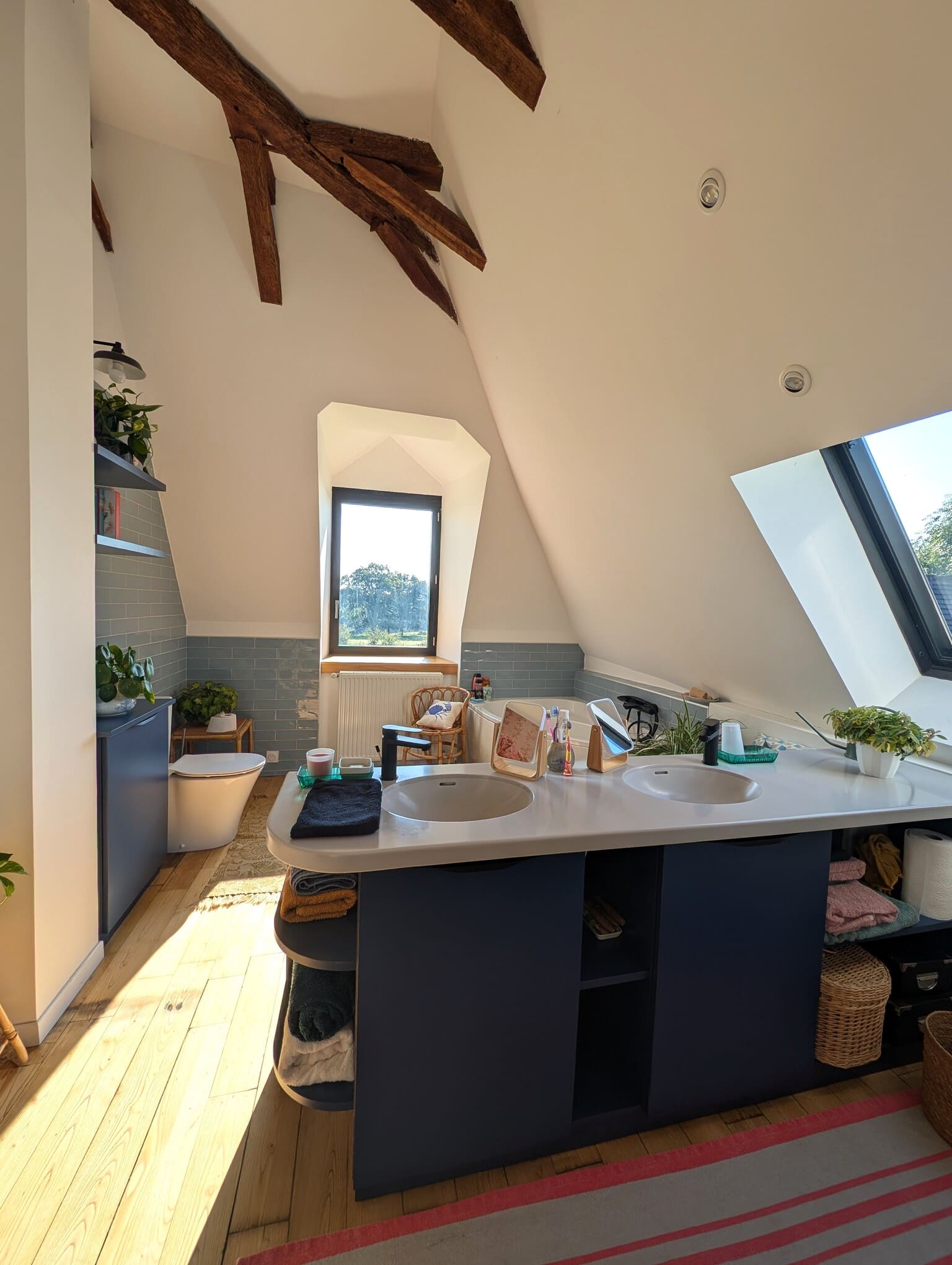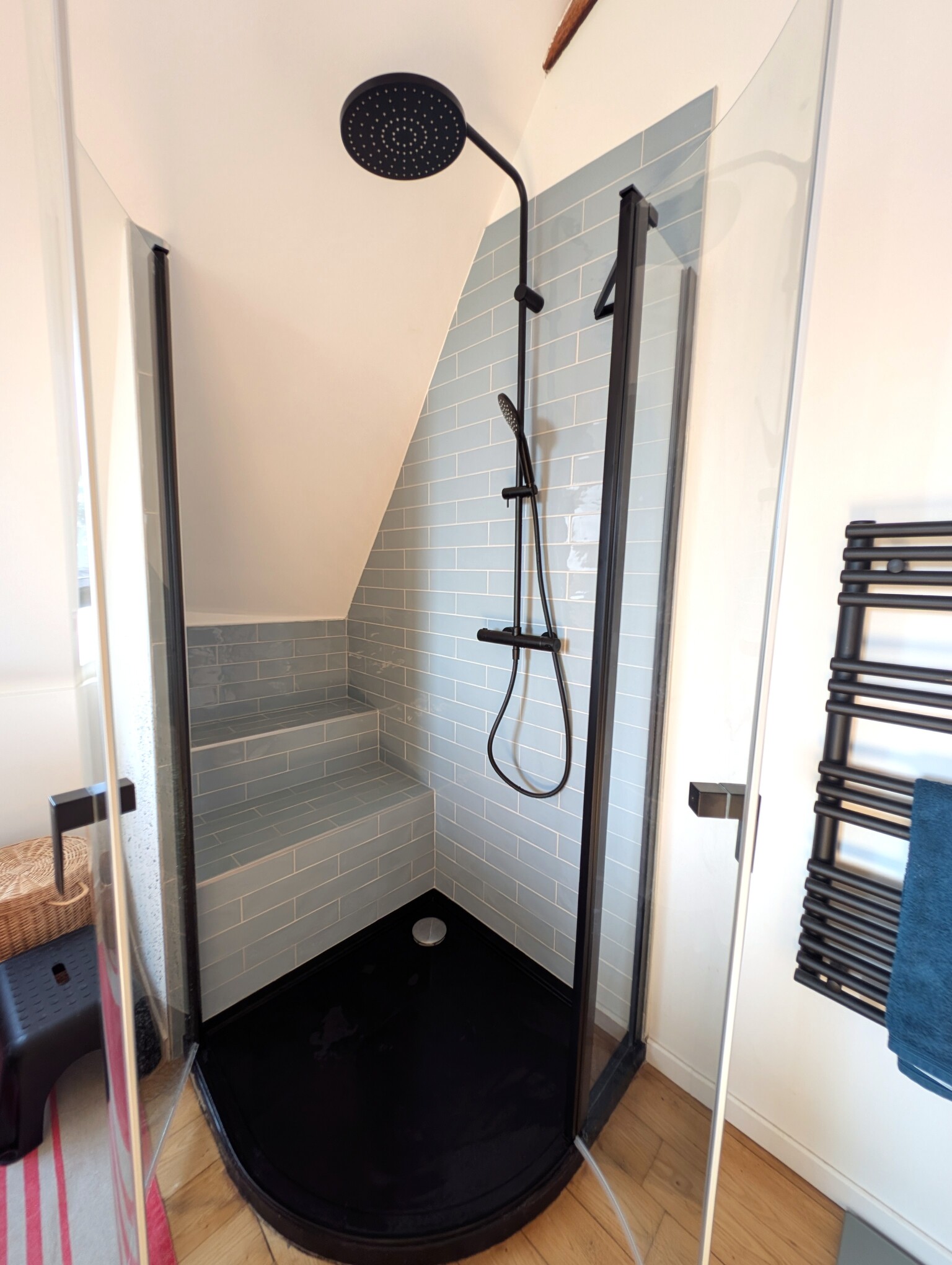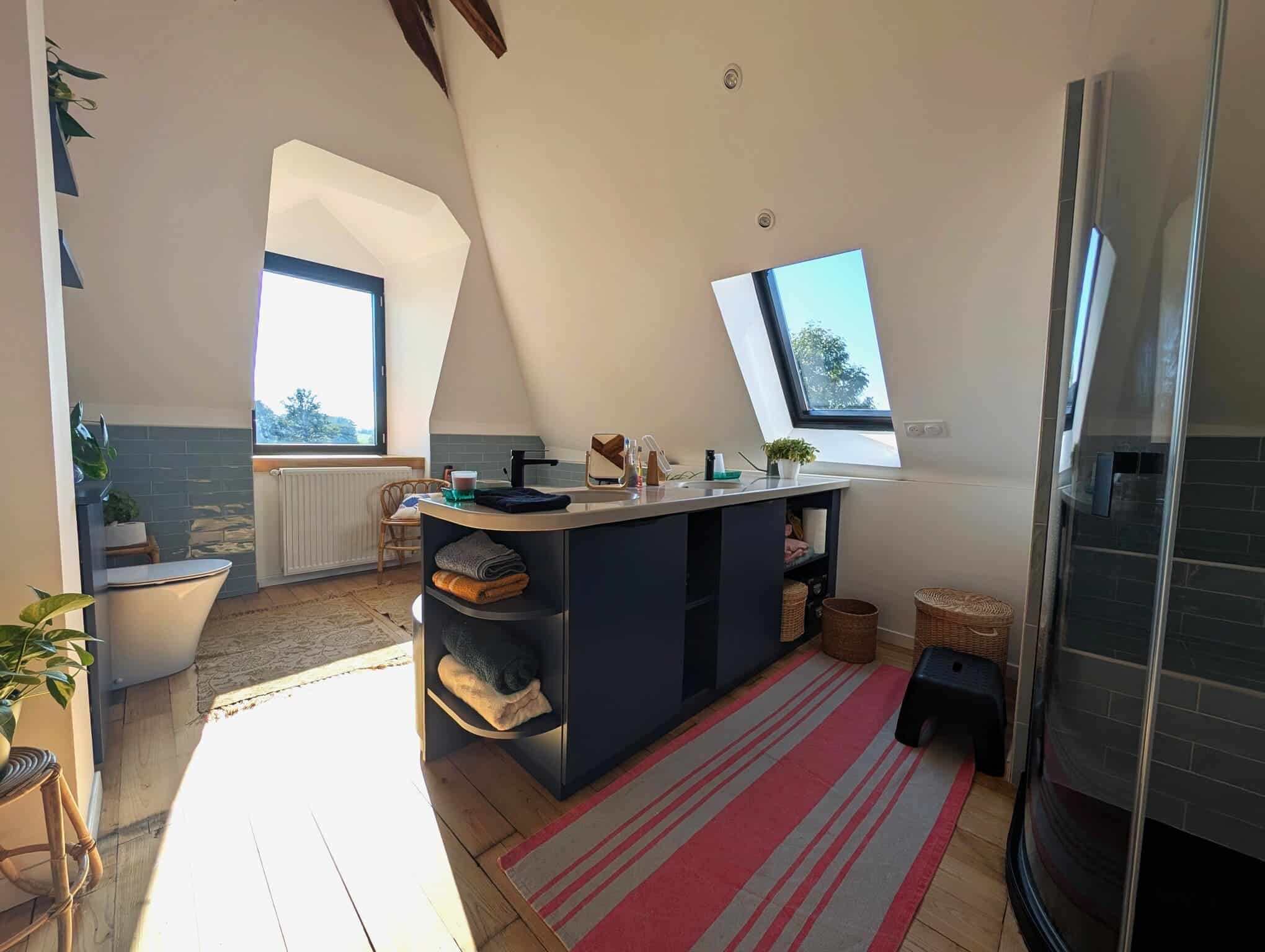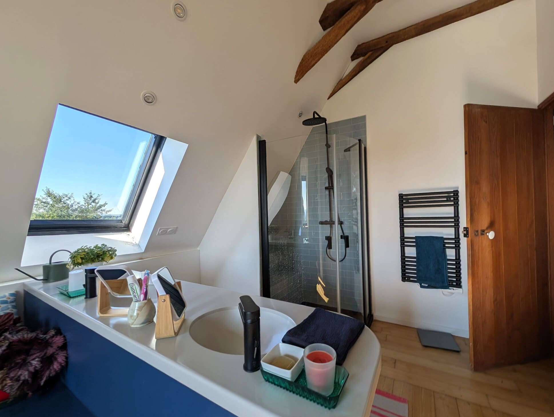 – Salle de bain : L’agencement est entièrement revu pour améliorer la circulation et le confort. Une grande douche avec paroi vitrée apporte profondeur et luminosité. Un meuble-vasque sur mesure optimise le rangement et propose des assises au dos. Cette pièce en mansarde impose une réflexion spécifique pour exploiter au maximum la pièce tout en assurant un confort d’utilisation optimal.