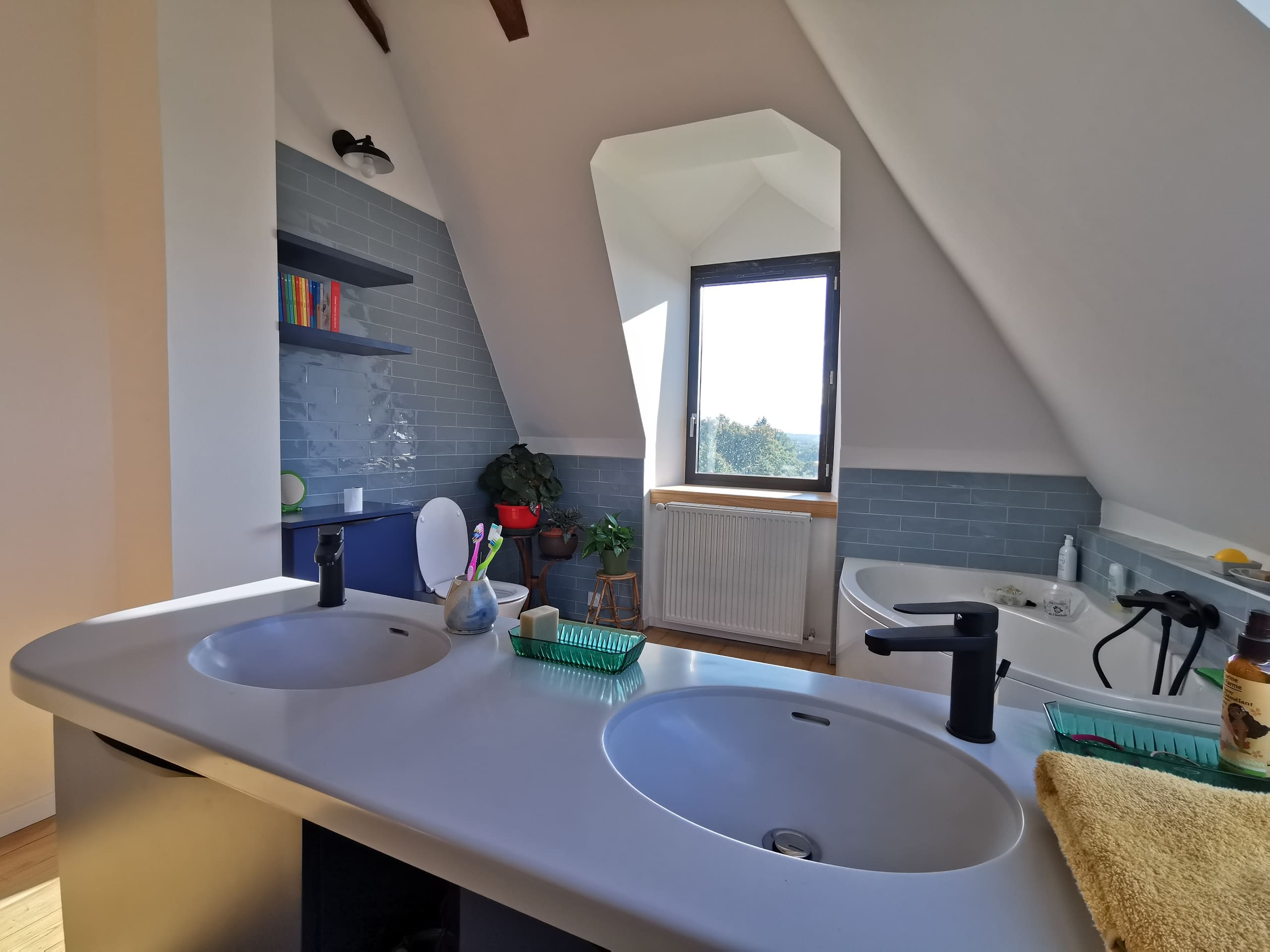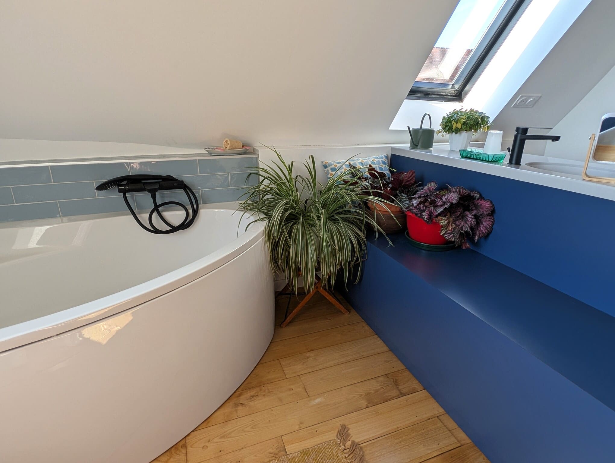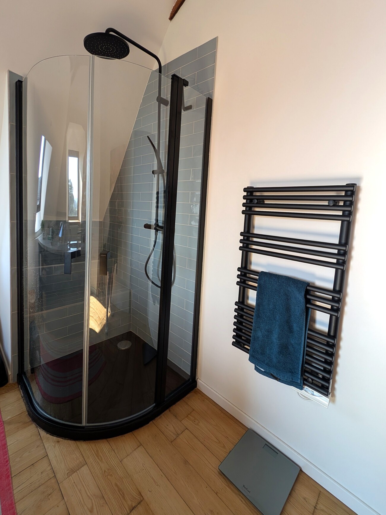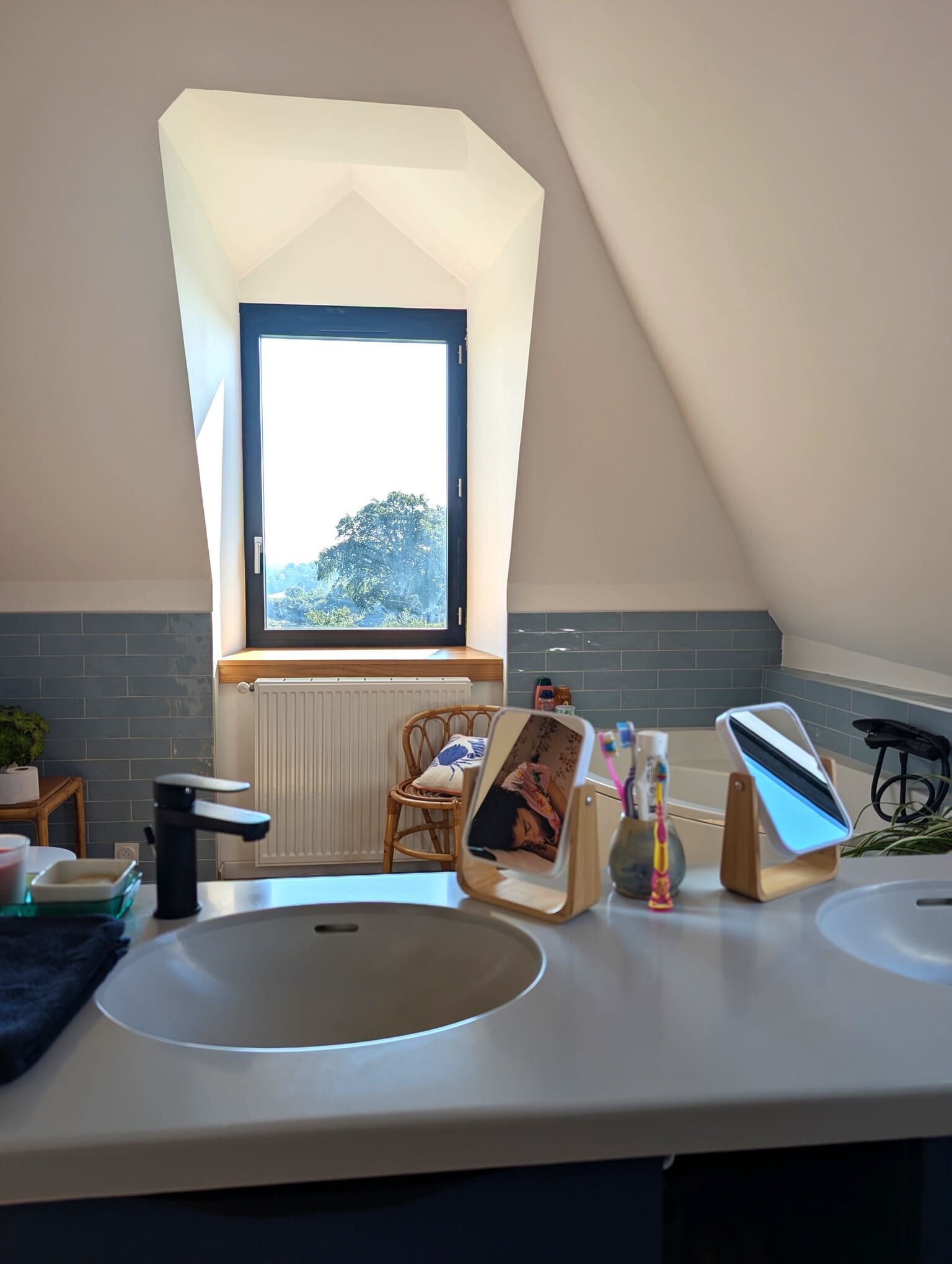 – Salle de bain : L’agencement est entièrement revu pour améliorer la circulation et le confort. Une grande douche avec paroi vitrée apporte profondeur et luminosité. Un meuble-vasque sur mesure optimise le rangement et propose des assises au dos. Cette pièce en mansarde impose une réflexion spécifique pour exploiter au maximum la pièce tout en assurant un confort d’utilisation optimal.