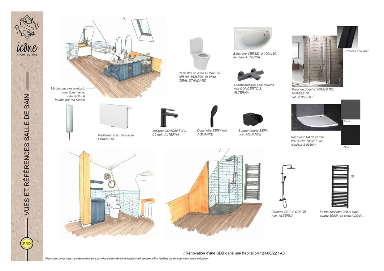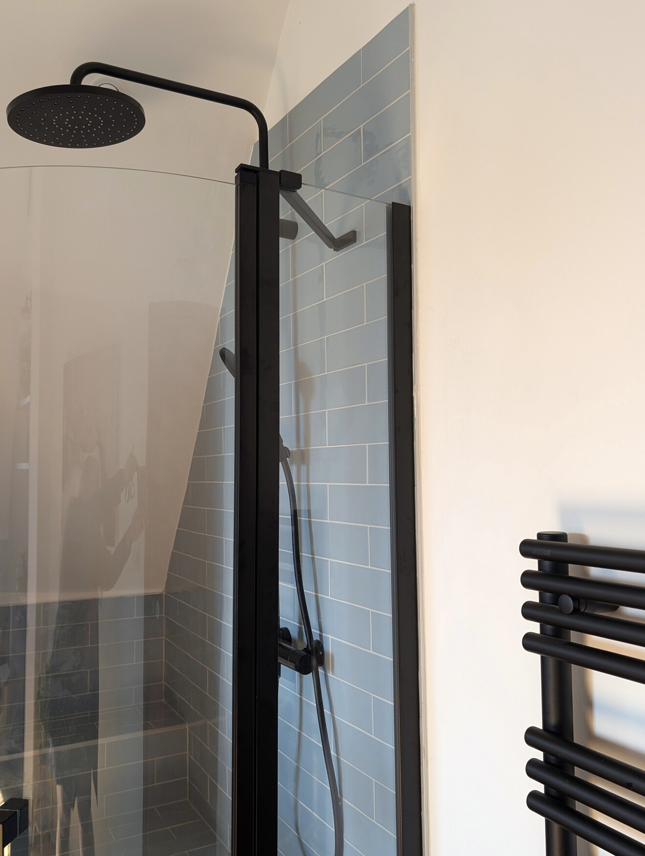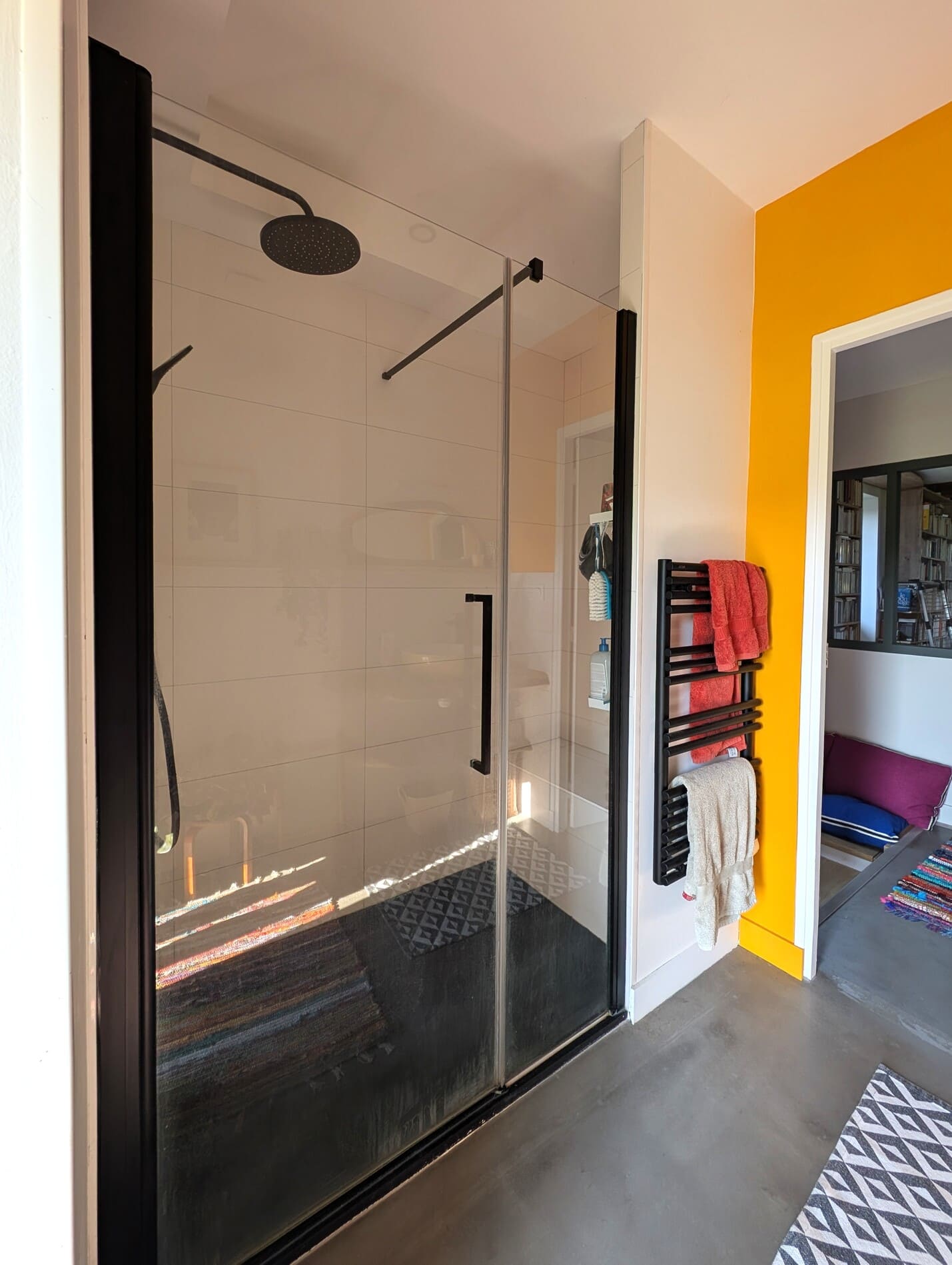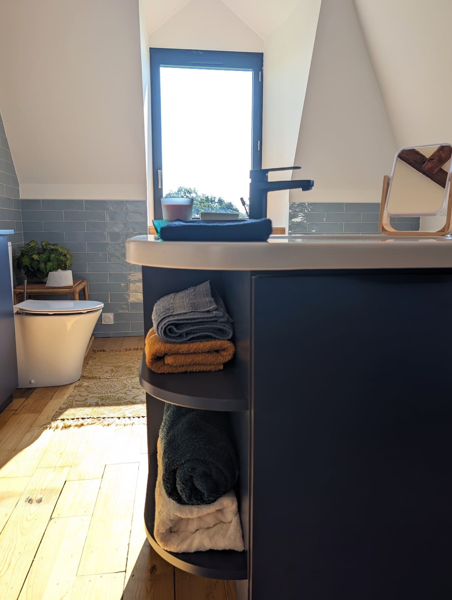 – Salle de bain : L’agencement est entièrement revu pour améliorer la circulation et le confort. Une grande douche avec paroi vitrée apporte profondeur et luminosité. Un meuble-vasque sur mesure optimise le rangement et propose des assises au dos. Cette pièce en mansarde impose une réflexion spécifique pour exploiter au maximum la pièce tout en assurant un confort d’utilisation optimal.