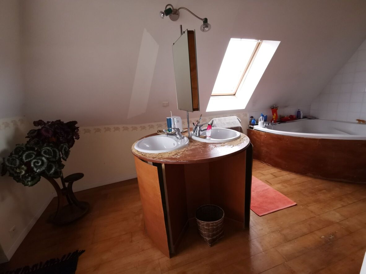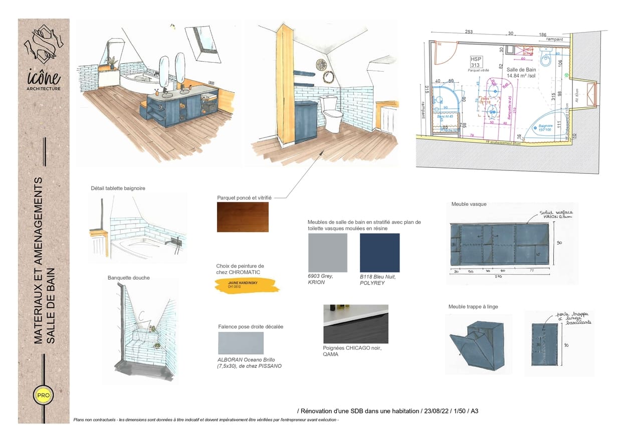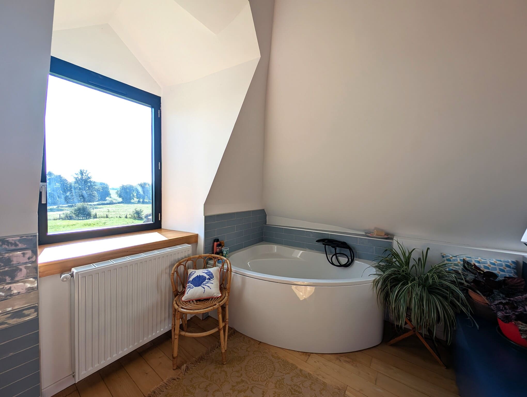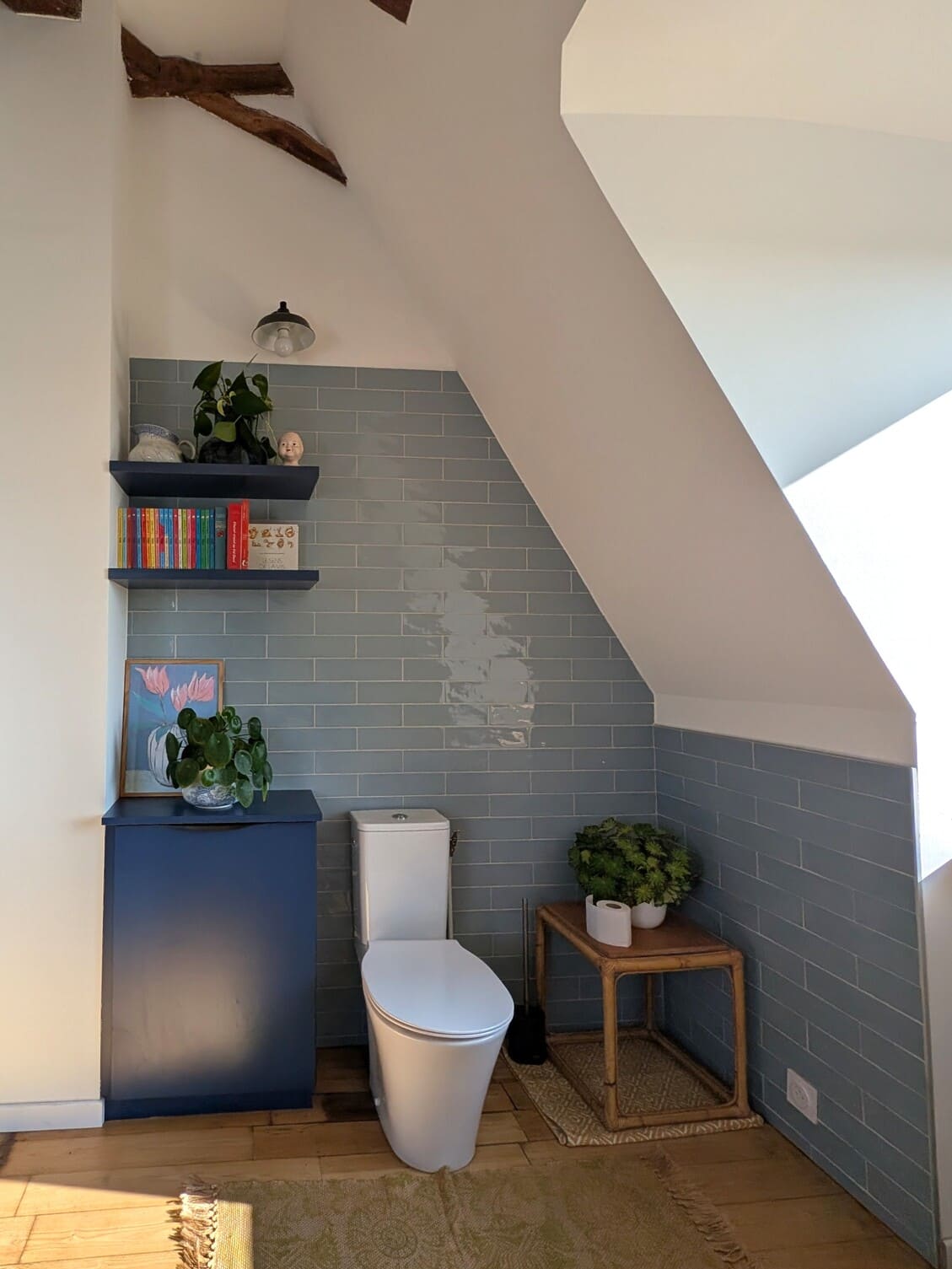 – Salle de bain : L’agencement est entièrement revu pour améliorer la circulation et le confort. Une grande douche avec paroi vitrée apporte profondeur et luminosité. Un meuble-vasque sur mesure optimise le rangement et propose des assises au dos. Cette pièce en mansarde impose une réflexion spécifique pour exploiter au maximum la pièce tout en assurant un confort d’utilisation optimal.