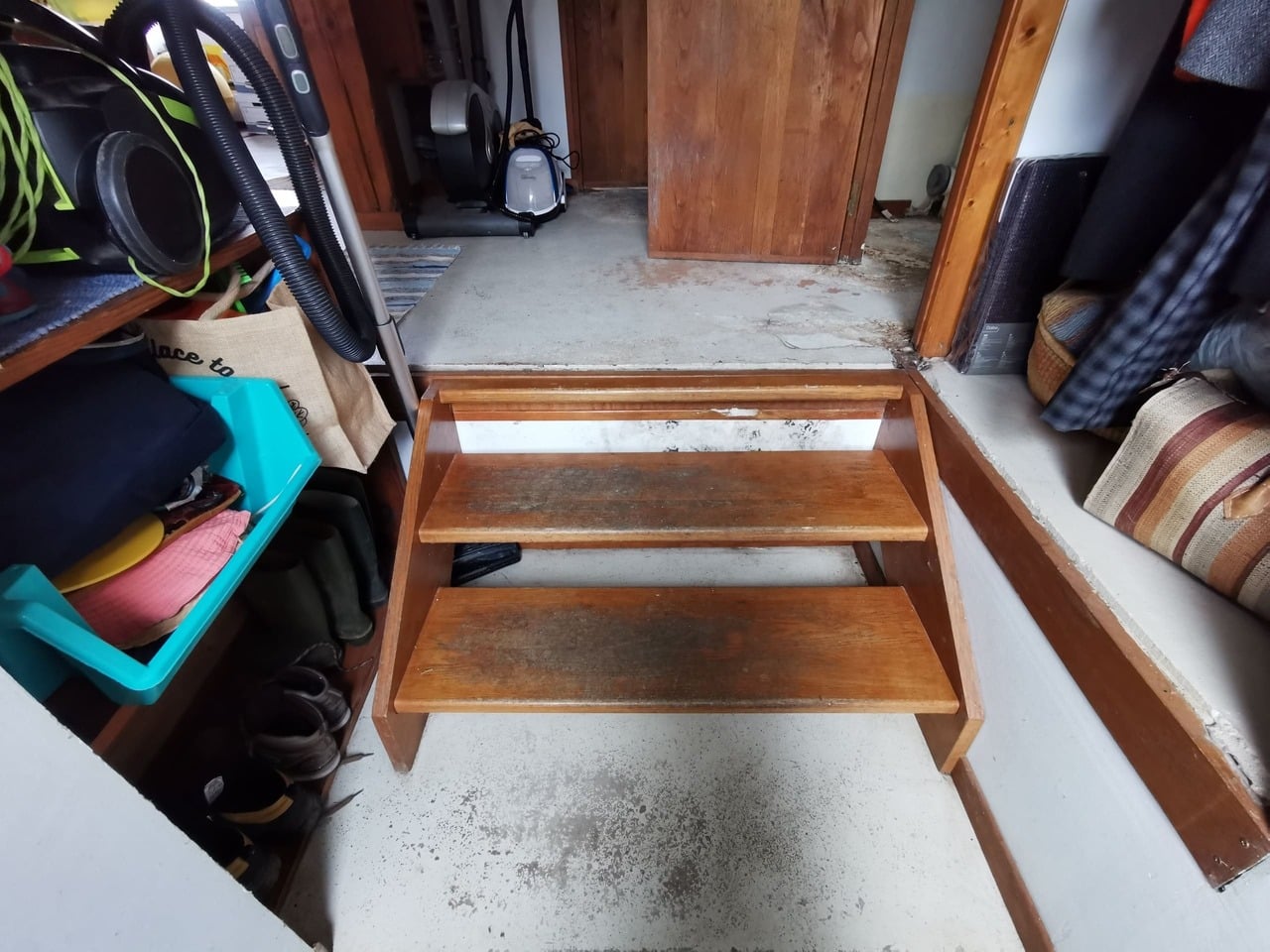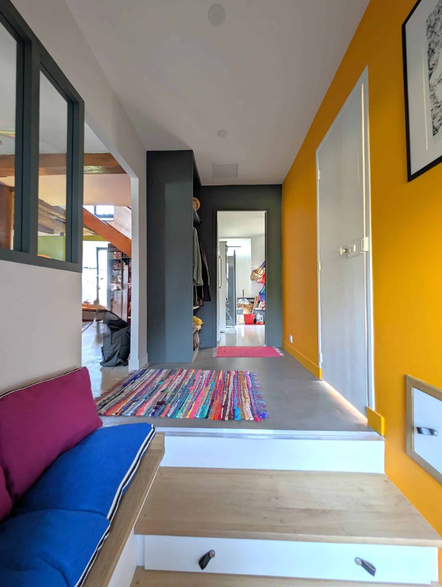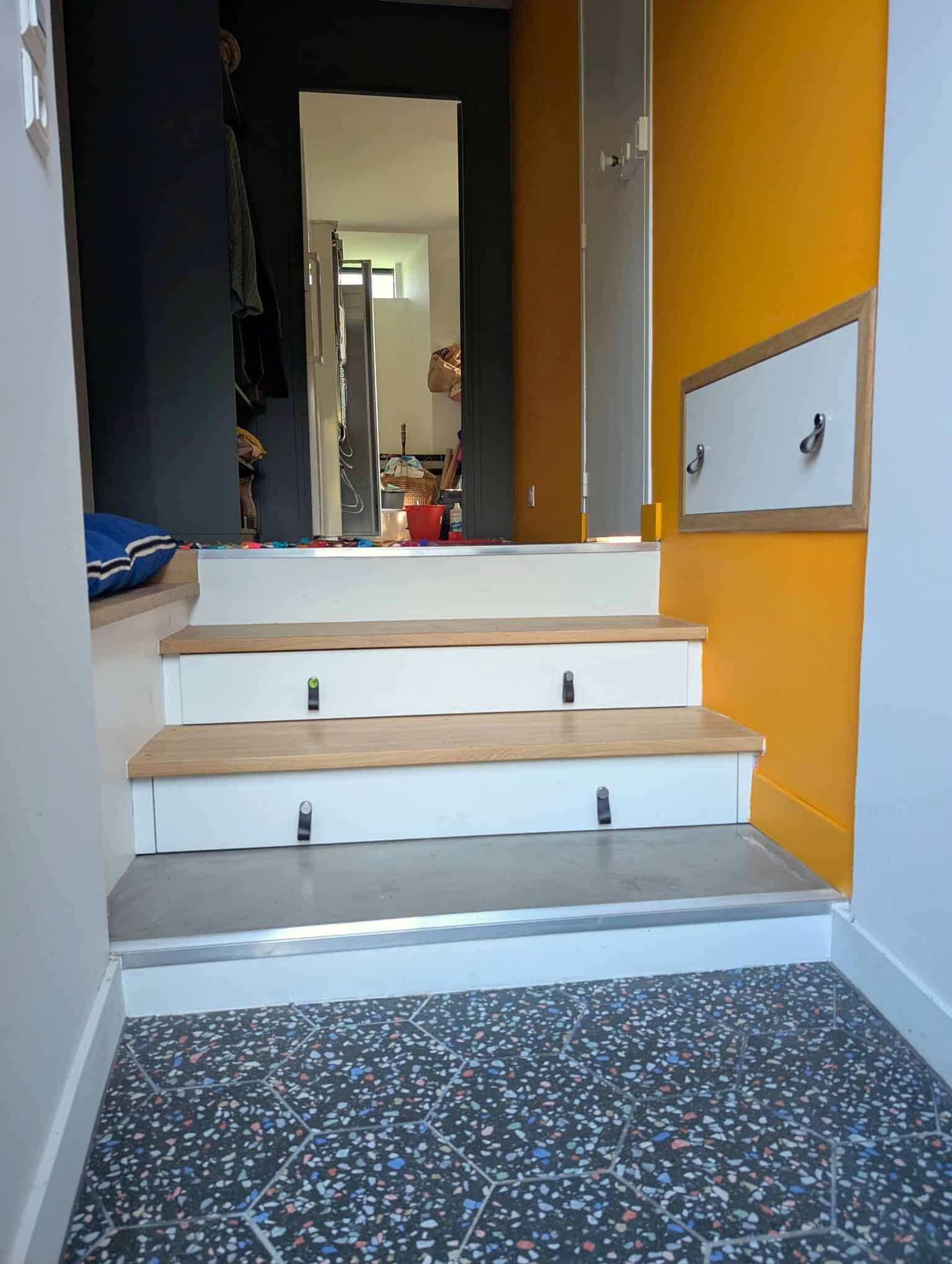 – Entrée : Conçue pour être à la fois fonctionnelle et esthétique, elle est optimisée afin de faciliter le quotidien. Une banquette intégrée sert de coffre de rangement, les marches de l’escalier sont transformées en tiroirs, optimisant chaque centimètre. Un tiroir supplémentaire, dissimulé à droite, s’ouvre sous la banquette de la douche de la salle d’eau, pour un rangement optimisé. Un dressing sur mesure complète l’espace sans alourdir visuellement l’ensemble.