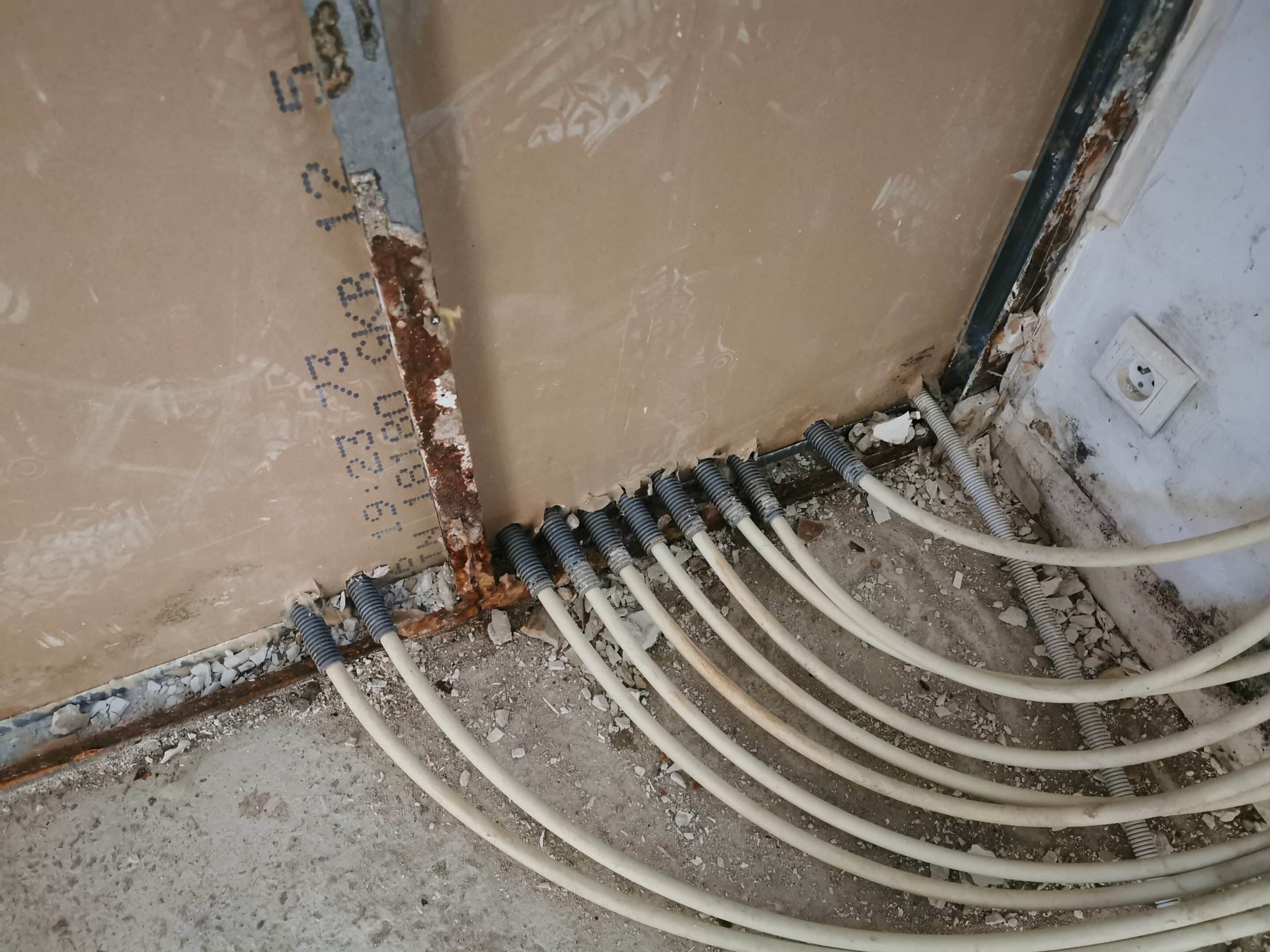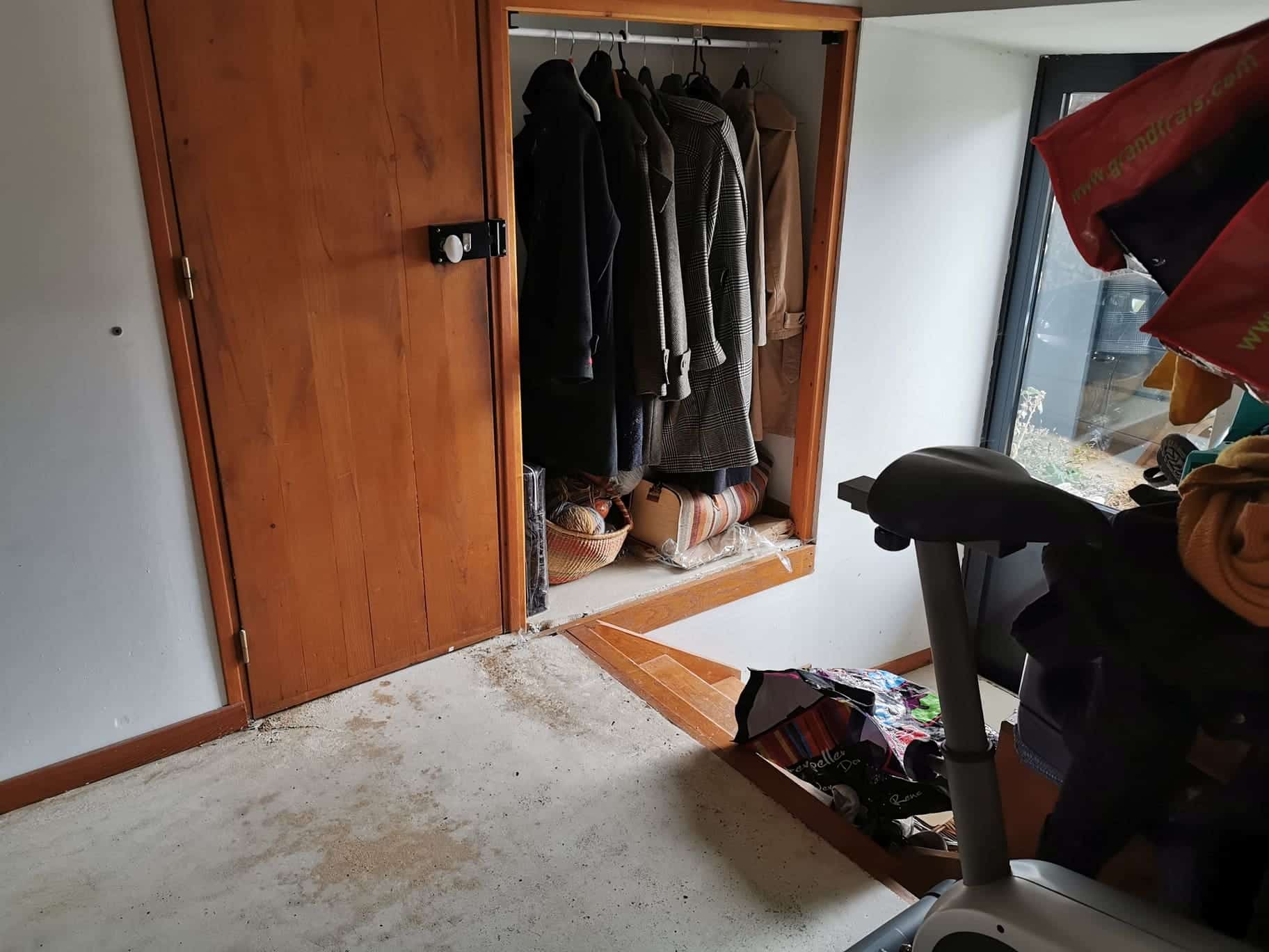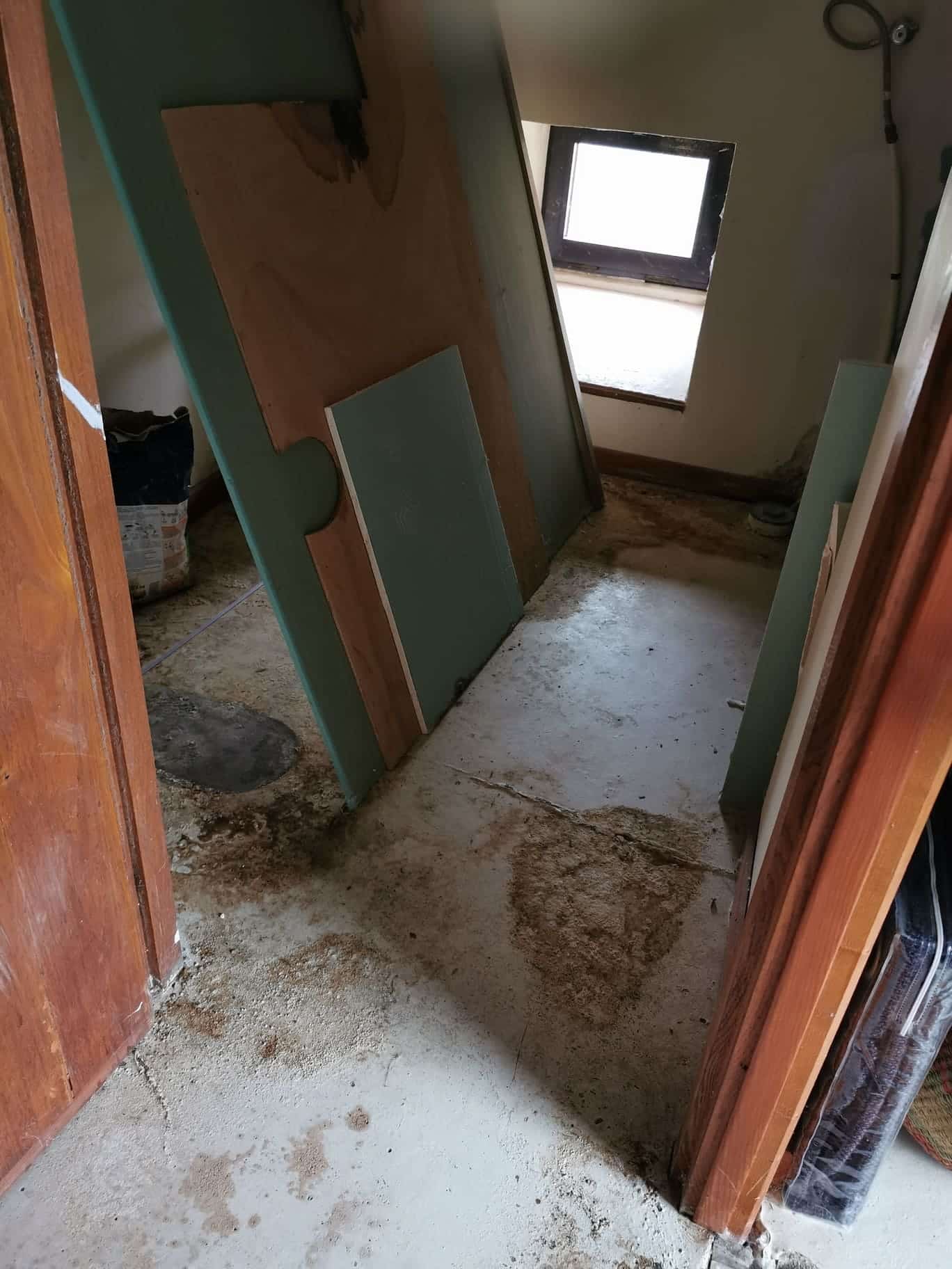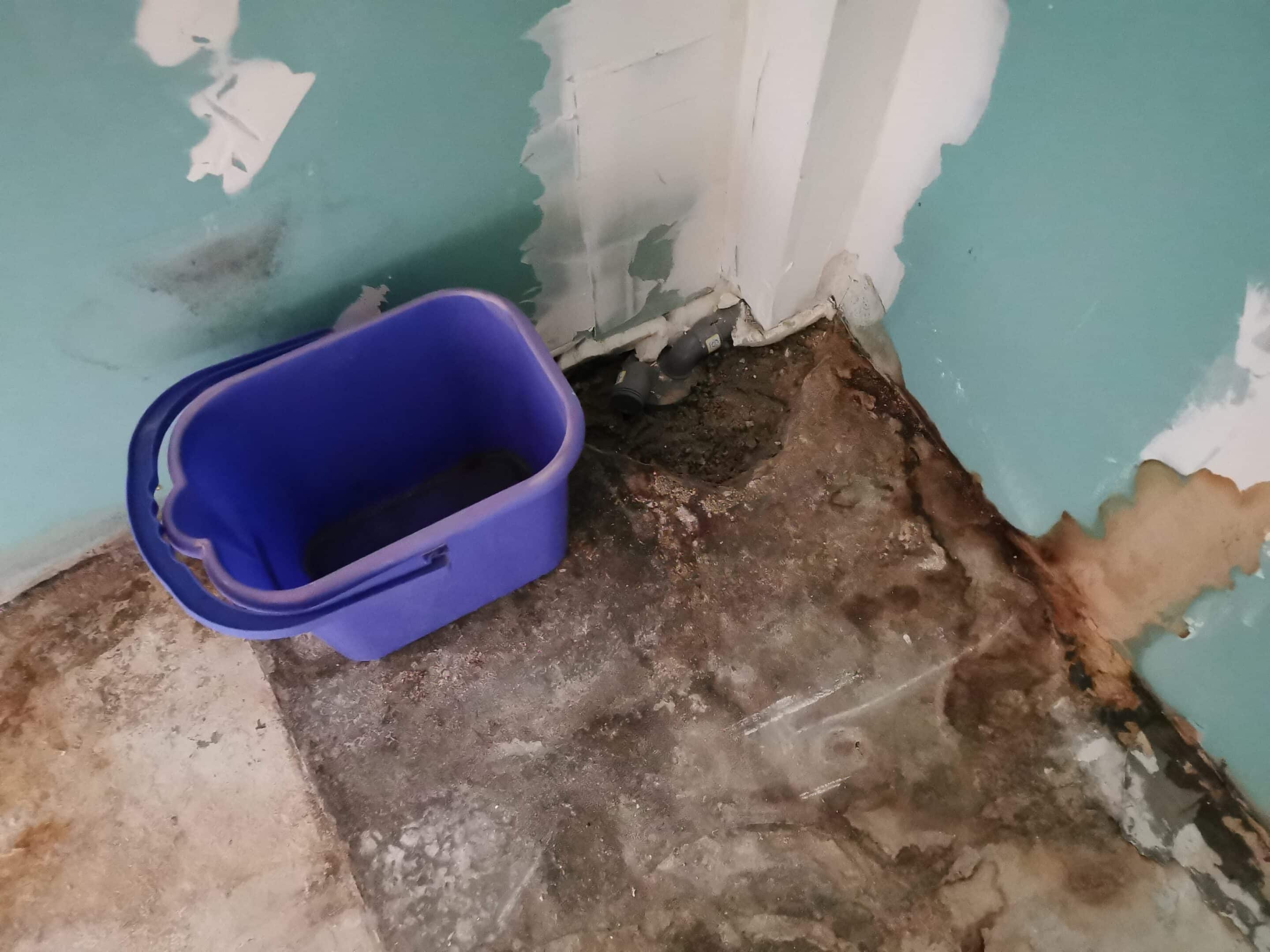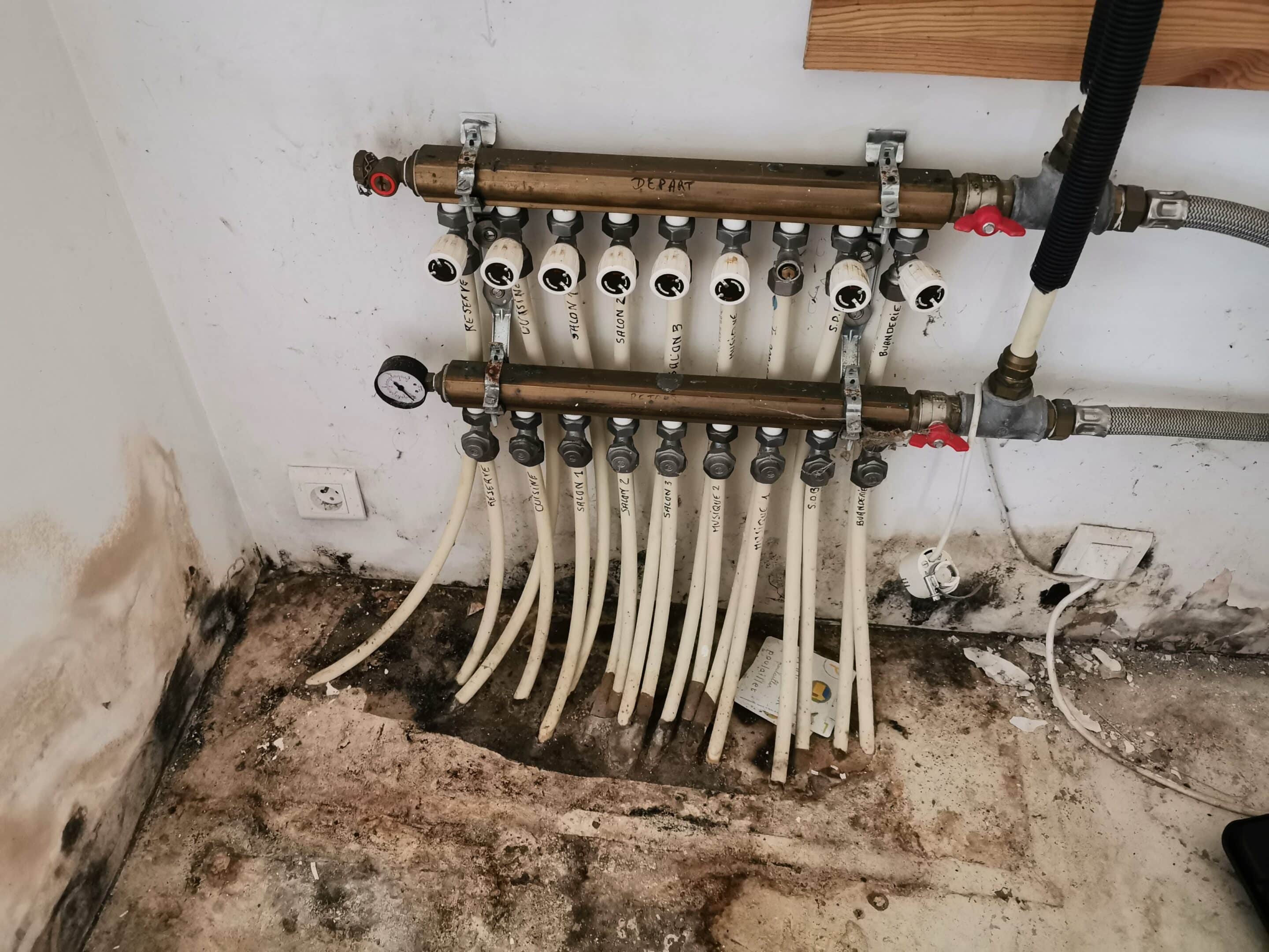 L’un des enjeux principaux est la gestion des infiltrations d’eau qui compromettent la salubrité des lieux. Les murs, imprégnés d’humidité et de moisissures, nécessitent un traitement en profondeur et la réfection complète des surfaces. Un premier diagnostic visuel a permis de souligner que ce n’était pas simplement une infiltration d’eau de pluie de l’extérieur, c’était bien plus que ça! Une étude de recherche de fuite de l’entreprise La Cornée, a permis de relever des canalisations cassées en sous-oeuvre et une malfaçon de la chape. La chape a dû être cassée pour être remplacée et permettre la reprise complète des évacuations mal réalisées elles-aussi.
