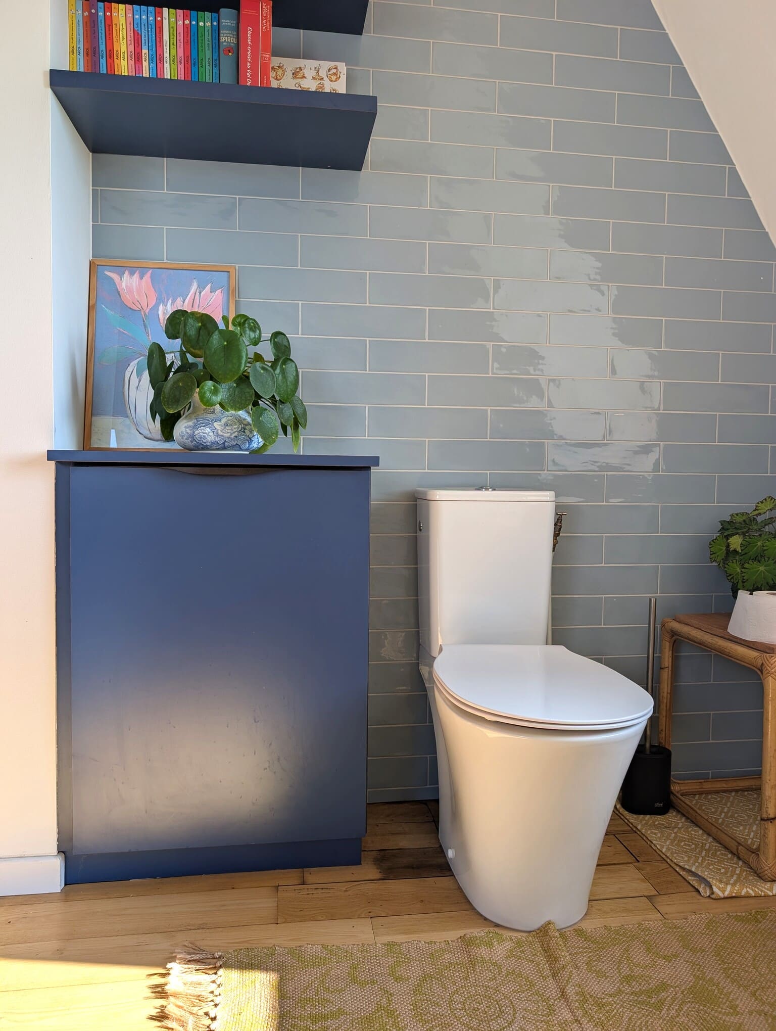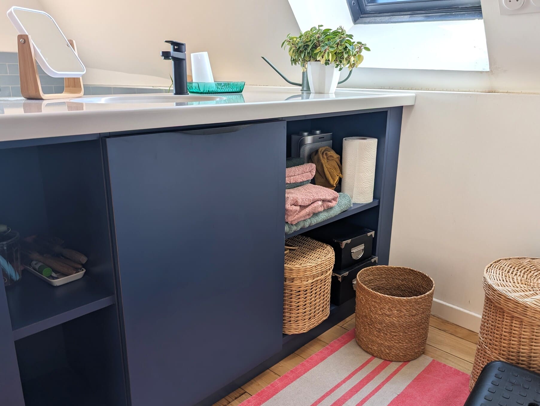 Les clients, amateurs d’art, souhaitent s’éloigner des standards conventionnels et apporter une vraie personnalité aux espaces rénovés. La salle de bains se distingue particulièrement par des couleurs vibrantes et inattendues. Plutôt que des tons neutres, des teintes profondes et contrastées sont choisies pour dynamiser l’espace. Les aménagements sur mesure renforcent cette ambiance unique et contemporaine.