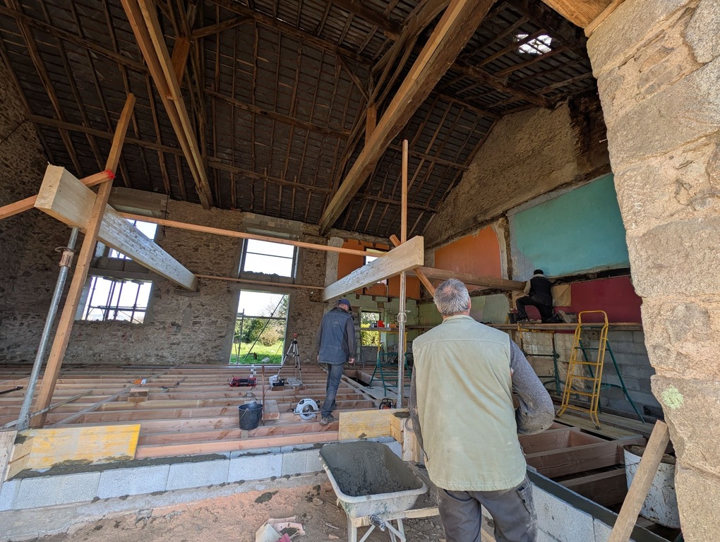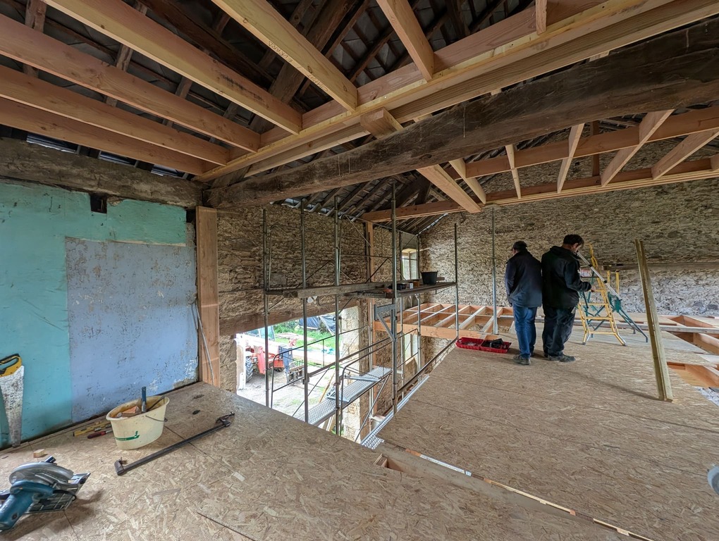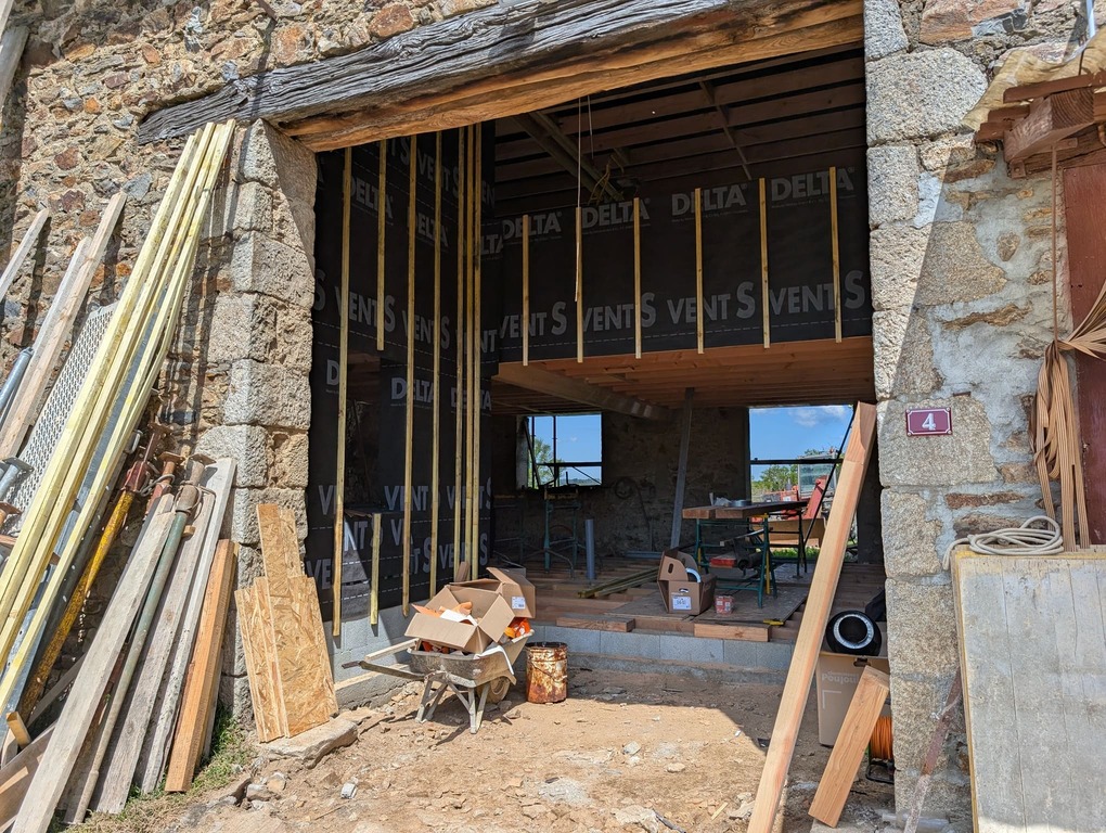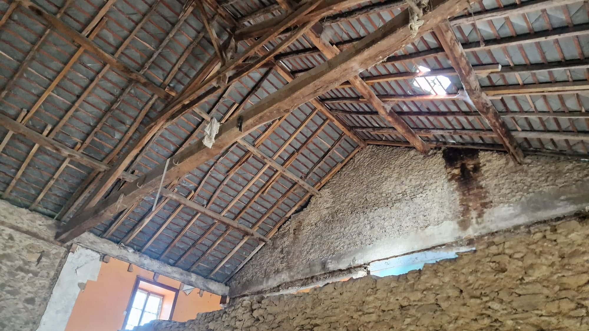 Le bâti se compose d’une maison attenante et d’une grange brute. Aucun des deux n’était habité, rénové ou isolé. Pourtant, les proportions, l’orientation et la qualité des maçonneries ouvraient de réelles possibilités.