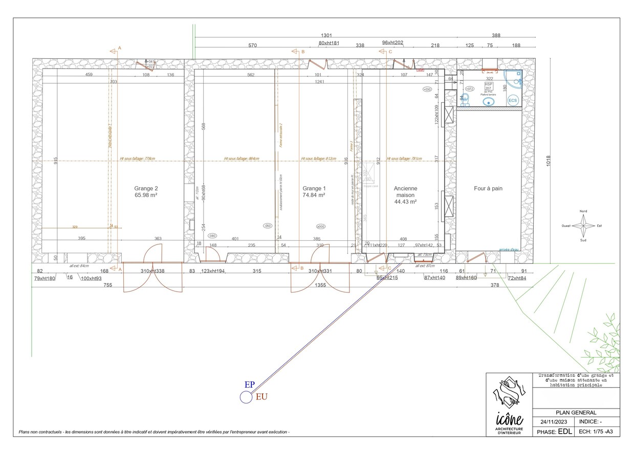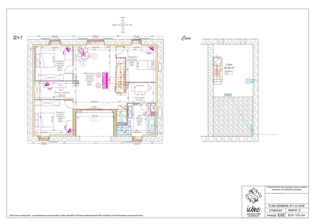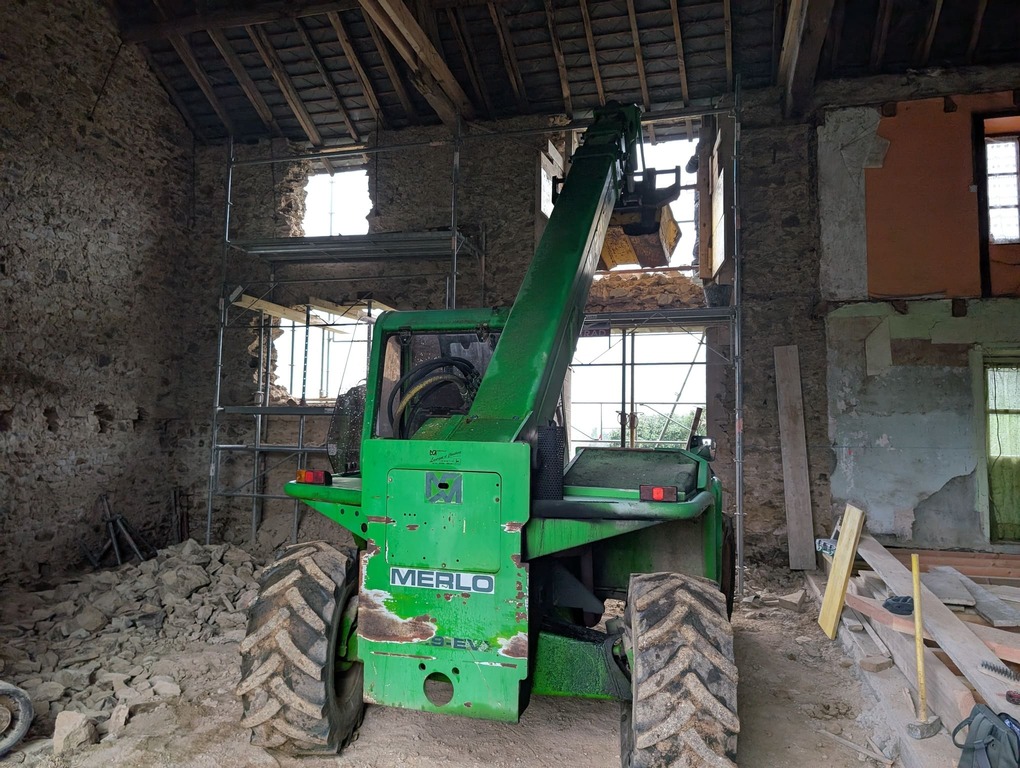 Le bâti se compose d’une maison attenante et d’une grange brute. Aucun des deux n’était habité, rénové ou isolé. Pourtant, les proportions, l’orientation et la qualité des maçonneries ouvraient de réelles possibilités.