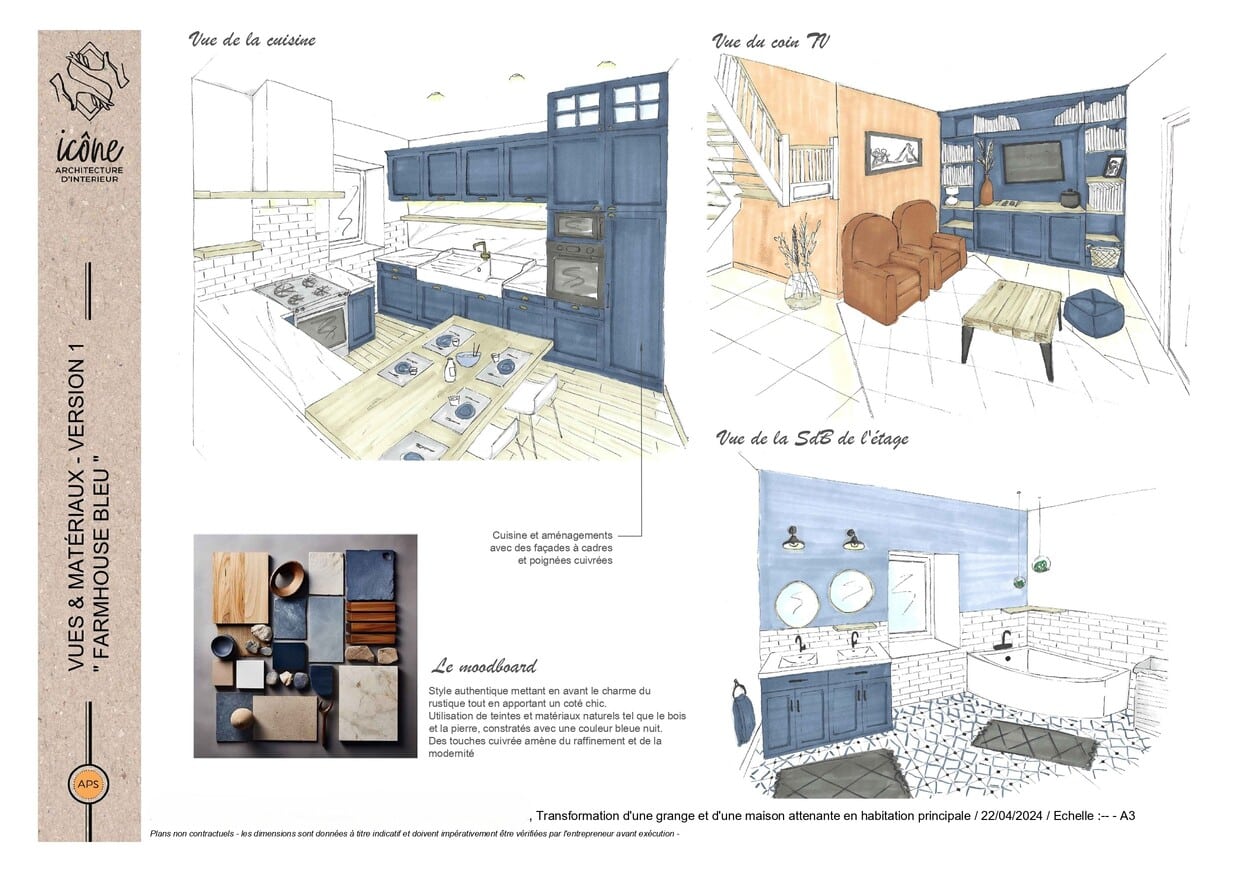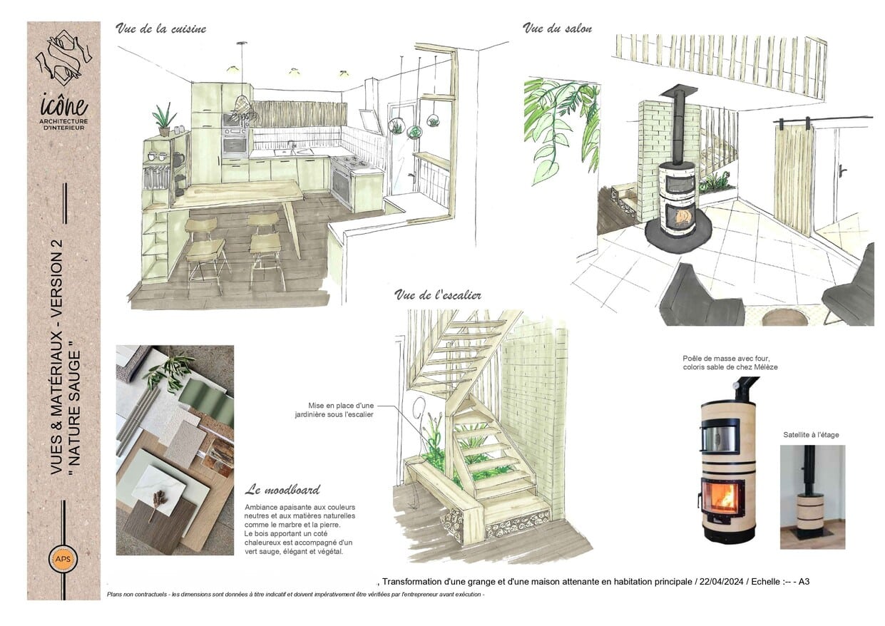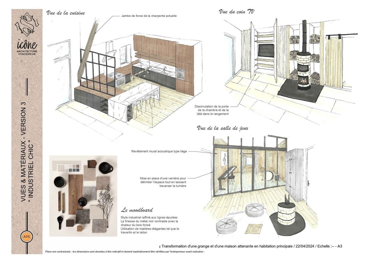 Ces planches ont été réalisées en phase d’Avant-Projet Sommaire afin d’explorer trois versions d’aménagement et de propositions d’ambiances, avant de définir le projet définitif. Elles ont permis d’explorer différentes sensibilités, du registre plus rustique au plus contemporain.